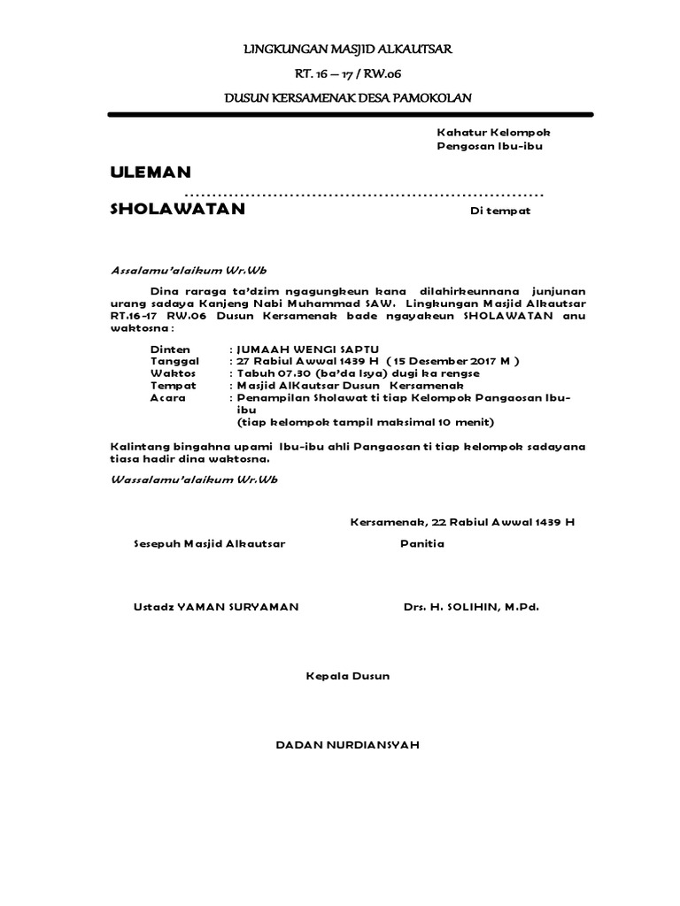 Dividio kali ini saya dan teman teman saya menghadiri undangan sholawatan diacara Keniten 2 bersholawat bersama Habib Haedar Alwi Assegaf dan Habib Syafik Al. Contoh undangan musyawarah tamir masjid mushalla. Contoh Surat Undangan Resmi yang Baik dan Benar 1.