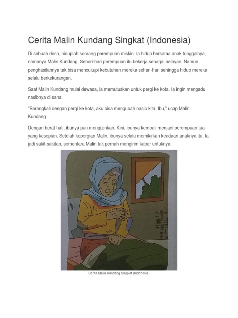 Kumpulan Cerita Rakyat Pendek dan Singkat Paling Terkenal. Ringkasan Cerita Malin Kundang. Terjemahan singkat cerita Malin Kundang dalam Bahasa Inggris sebagai berikut Pada zaman dahulu dikisahkan hidup seorang ibu dan anaknya bernama Malin Kundang.