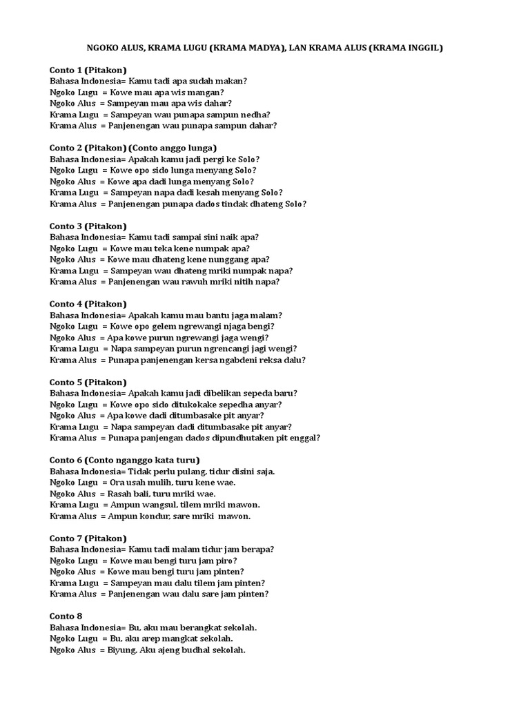 Unduh Contoh Ngoko Lugu PDF secara gratis di Kumpulan Tips Soal Jurnal Skripsi Makalah. Contoh teks pidato bahasa jawa ngoko alus are a topic that is being searched for and liked by netizens today. Maaf saya mau tanya rumah kak Budi itu di mana Ngoko lugu.